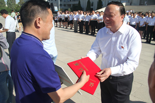 在當日同時舉行的“銀川市黨內(nèi)關(guān)愛資金”捐款儀式上,集團黨委捐款貳拾萬元。市委徐廣國書記給集團公司雷光新董事長頒獎。
